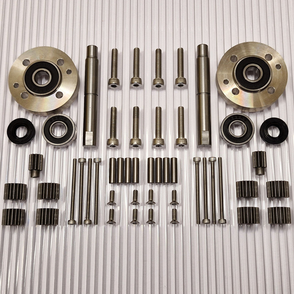 The gears are made of hardened high-quality steel. New pins for the planetary gears closest to the wheel are included. Stainless screws with torx and allen heads that do not slip.