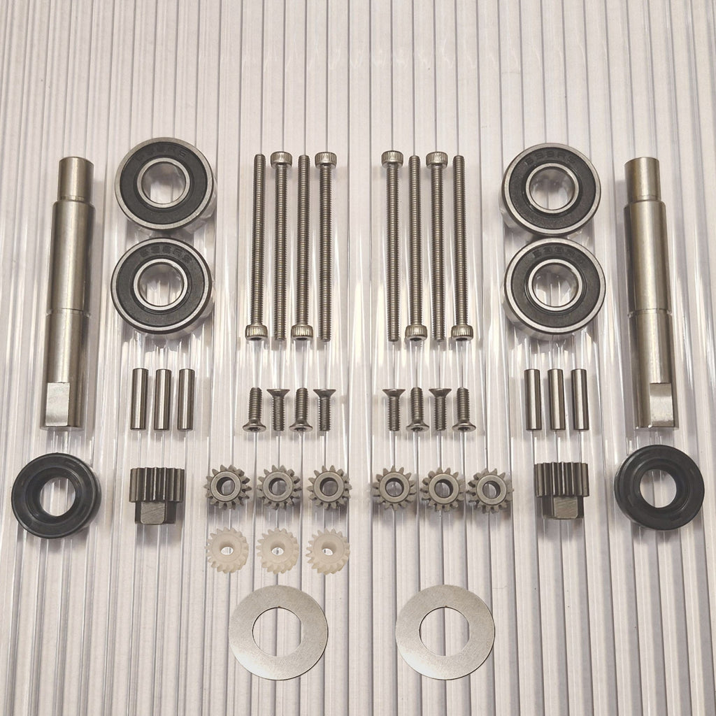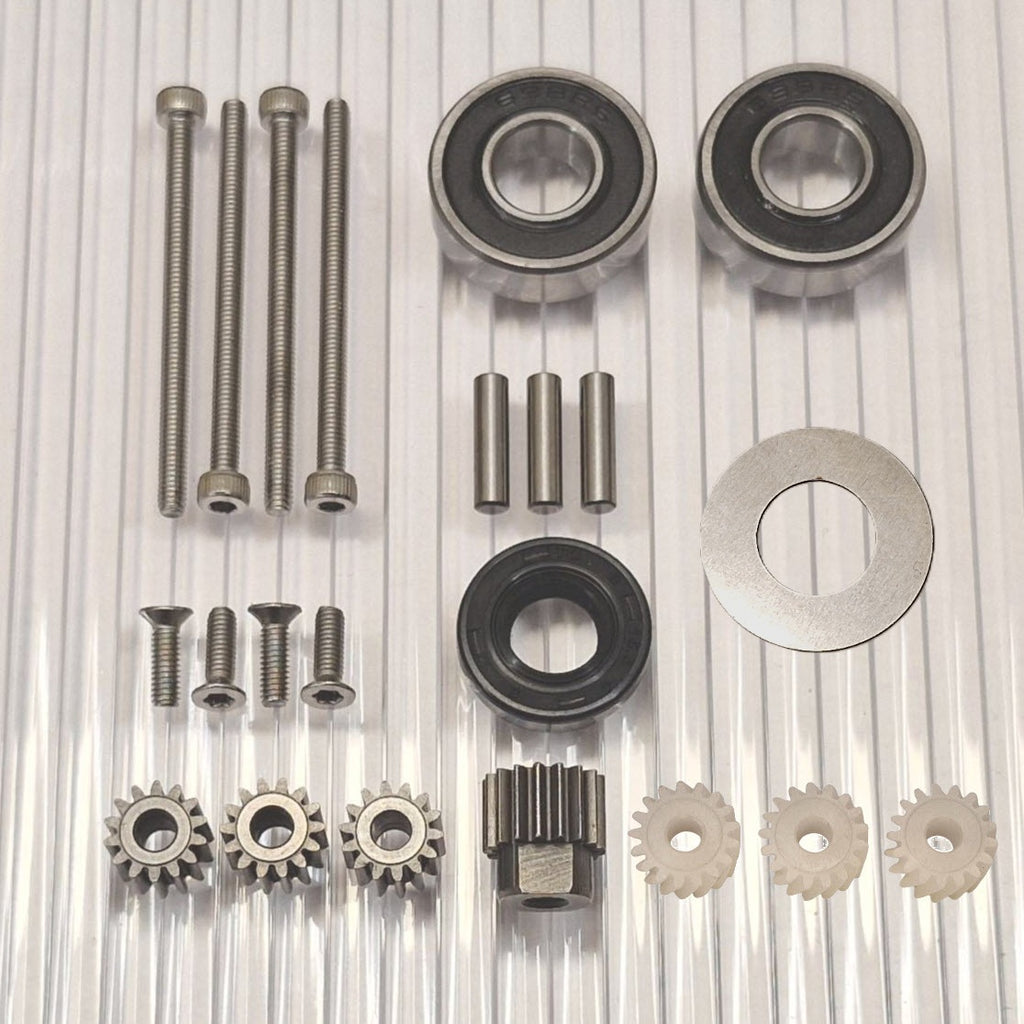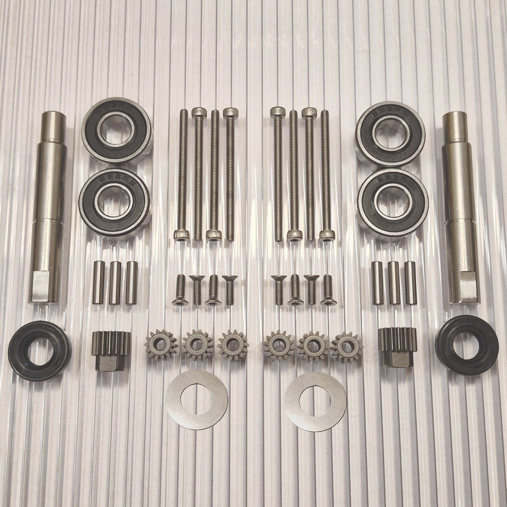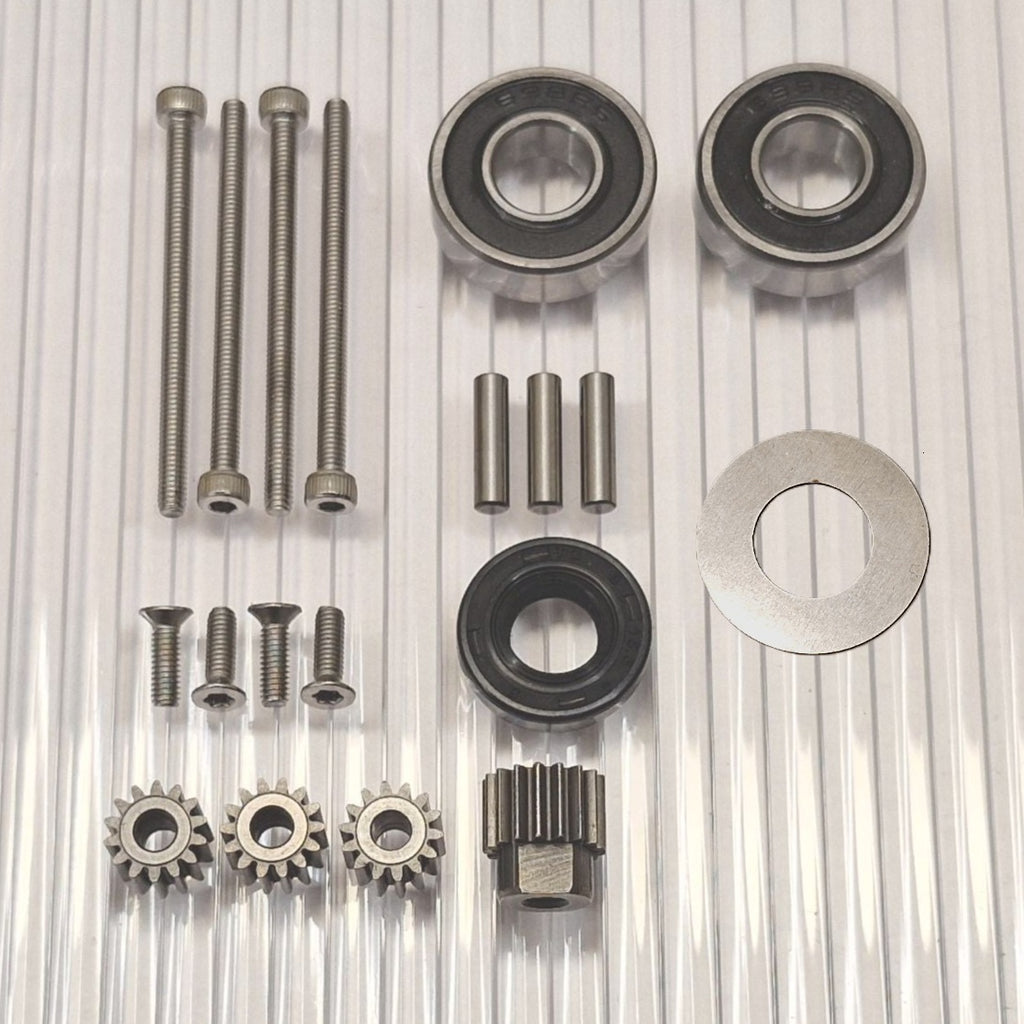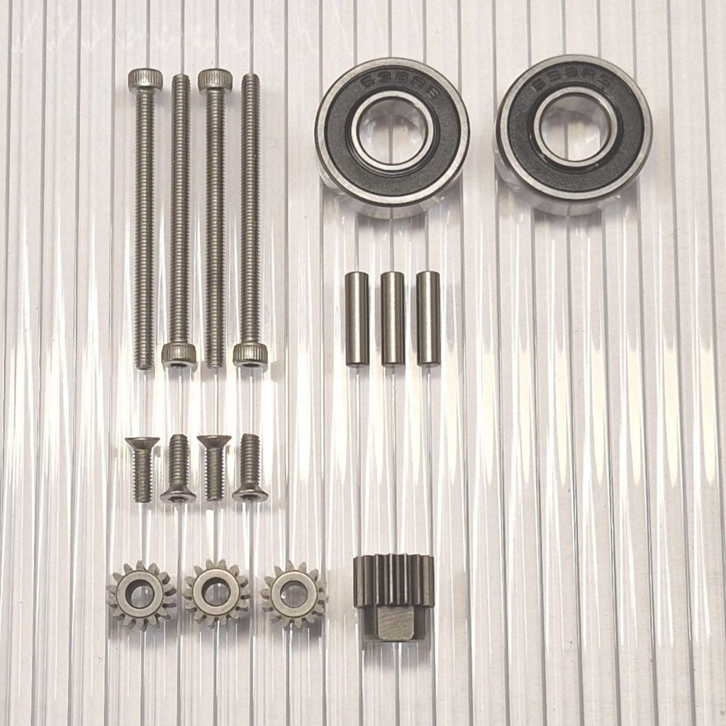 The gears are made of hardened high-quality steel. New pins for the planetary gears closest to the wheel are included. Stainless screws with torx and allen heads that do not slip.