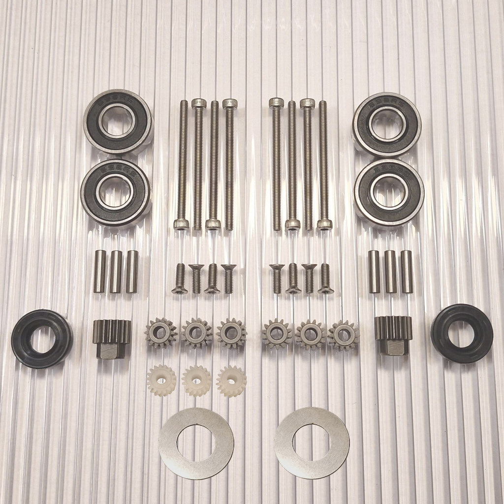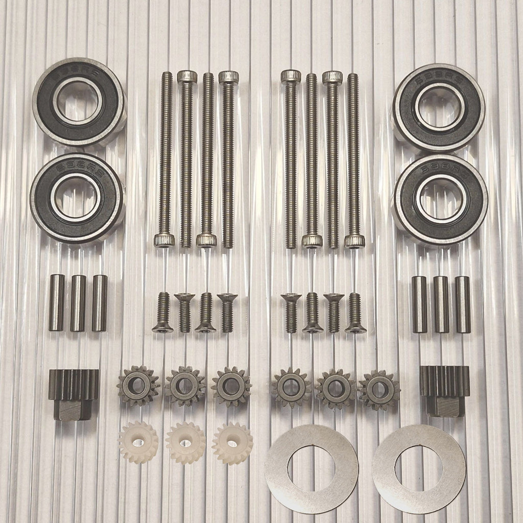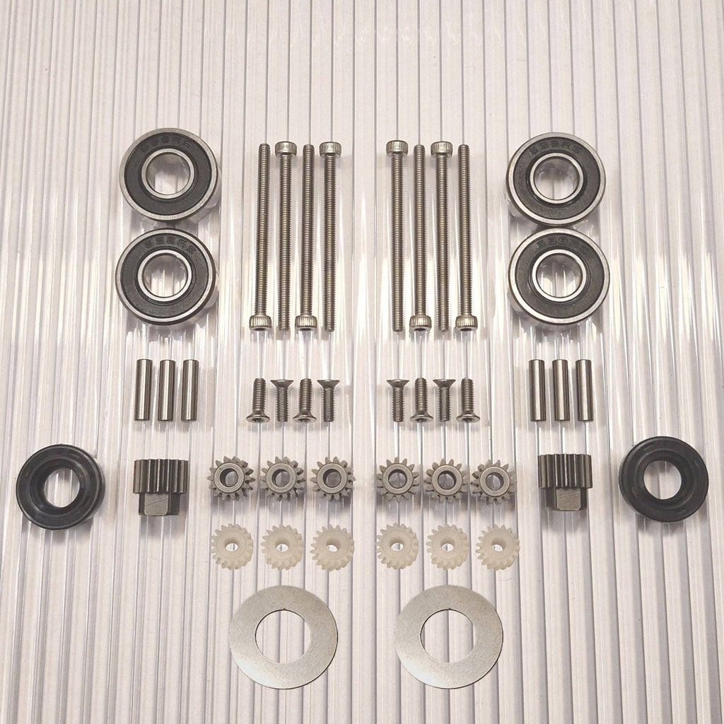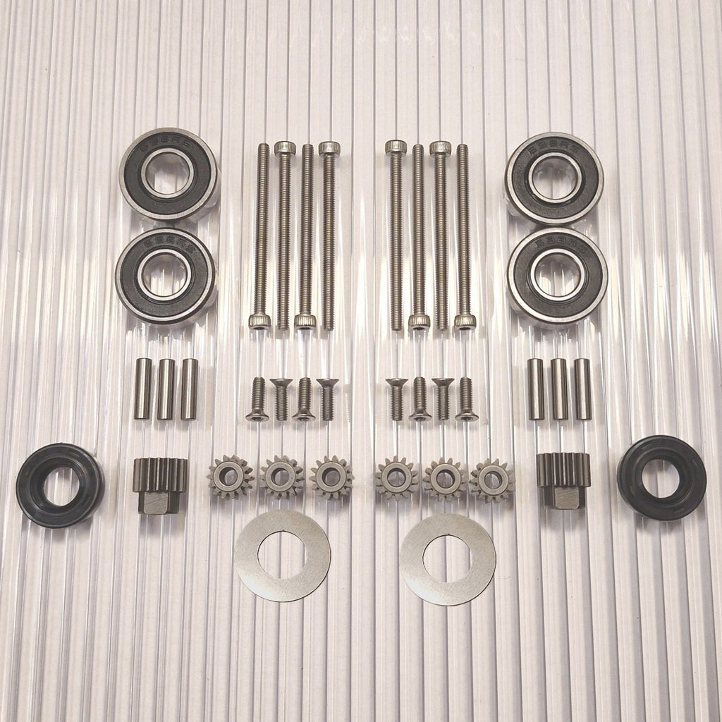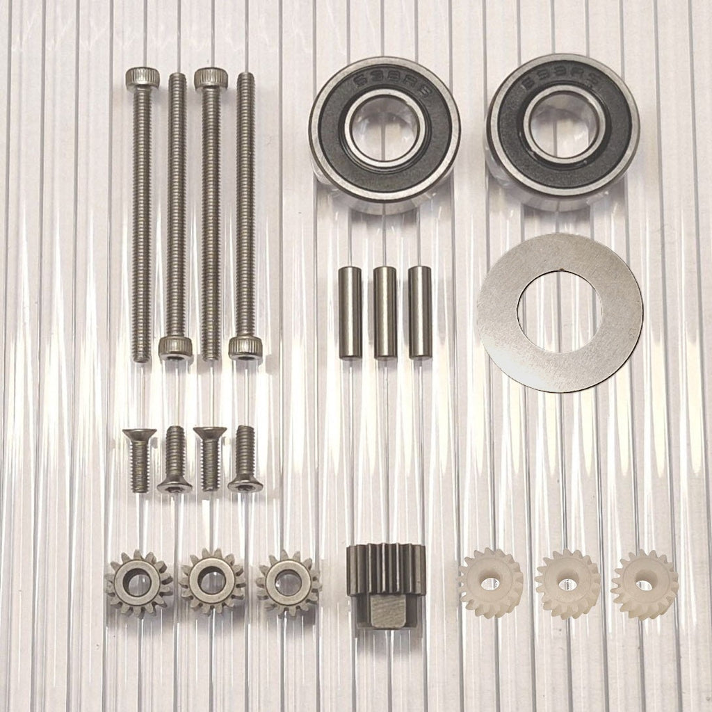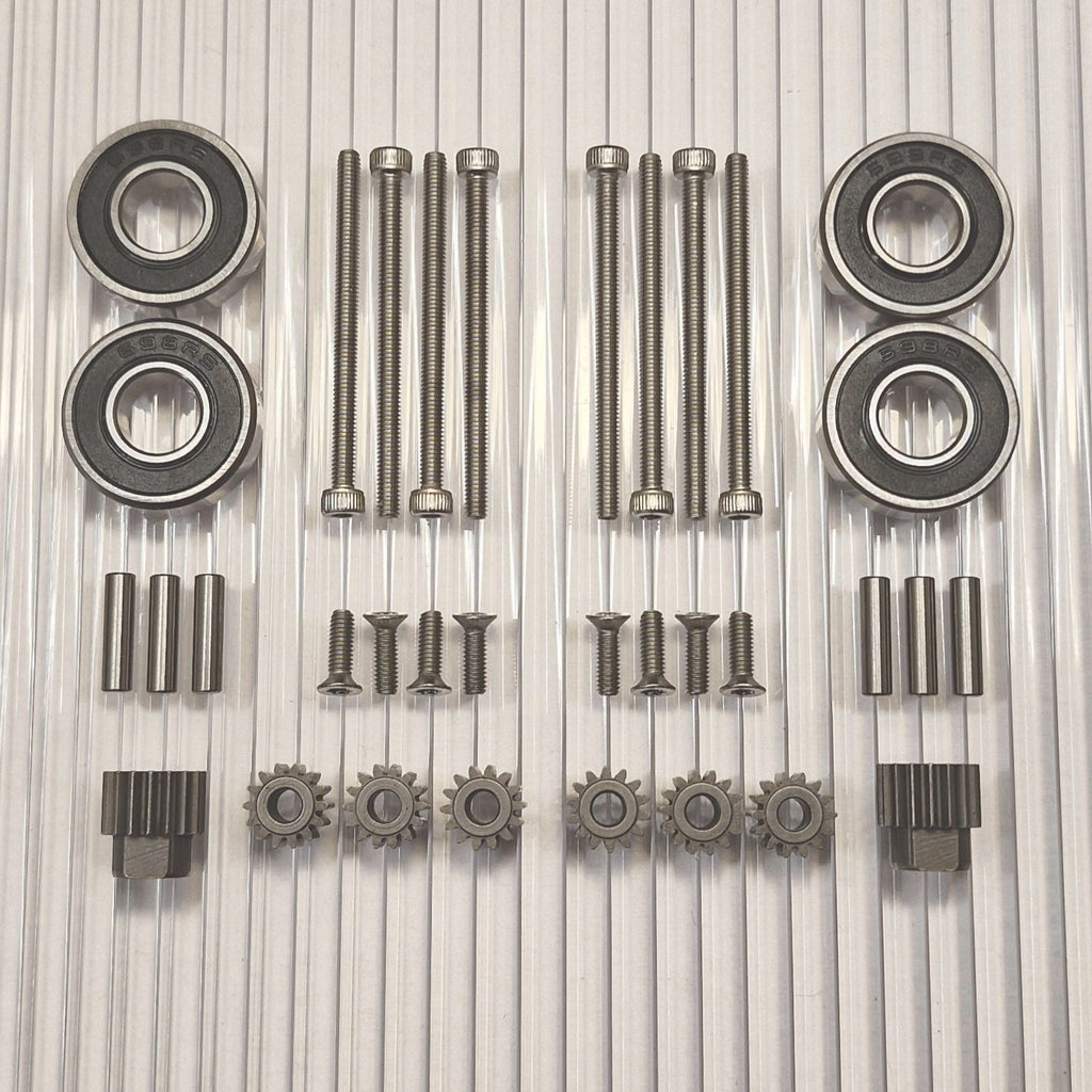 The gears are made of hardened high-quality steel. New pins for the planetary gears closest to the wheel are included. Stainless screws with torx and allen heads that do not slip.